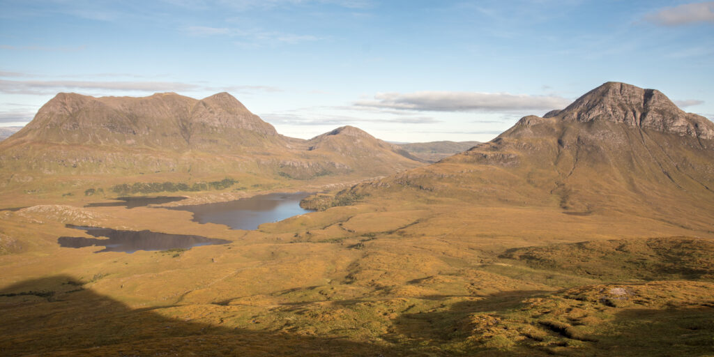 These twin summits form Assynt’s highest peaks. Climbed together, they offer rocky ridges and sweeping views.